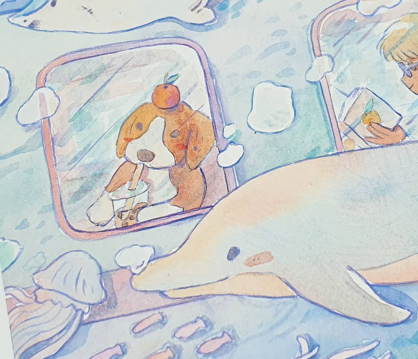 I chose the color scheme for the illustration, I wanted it to be pastel-like, soft, calm and looks submerging in the ocean. Once I finished the final sketch, I drafted the final version one. I decided to use purplish blue painting line for the outline. Therefore, I drew the blue line before painting or masking the fluid.